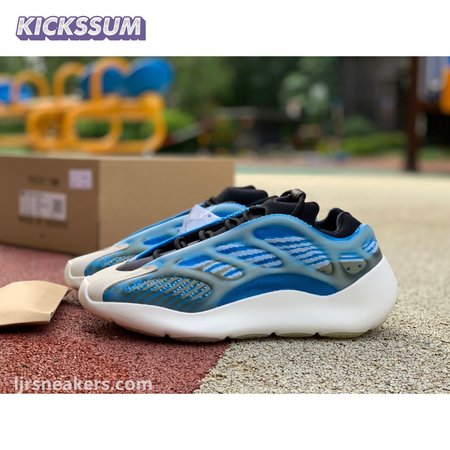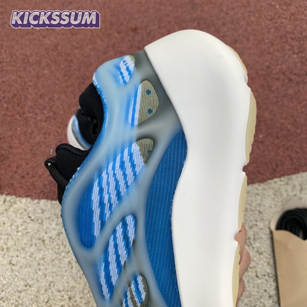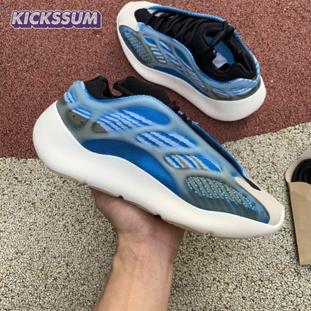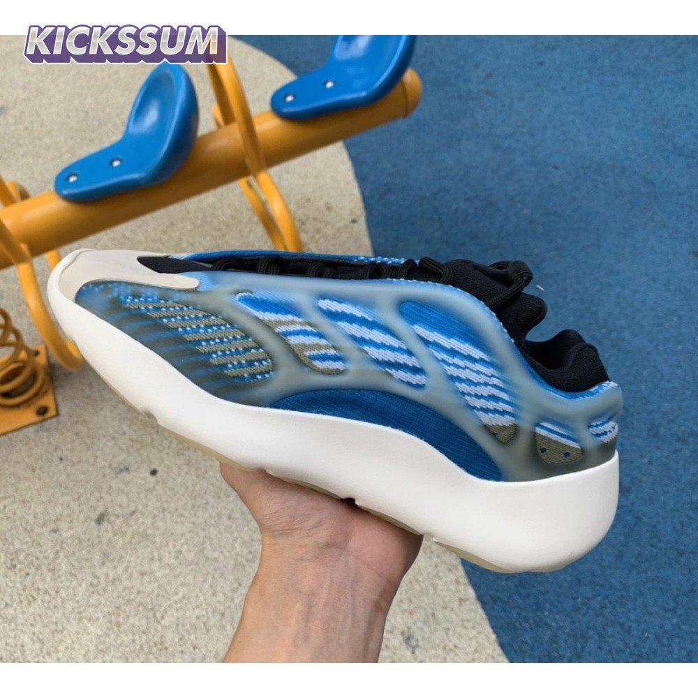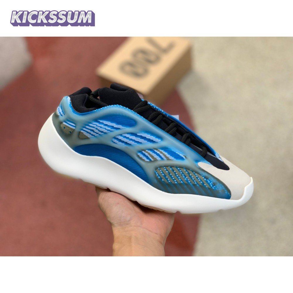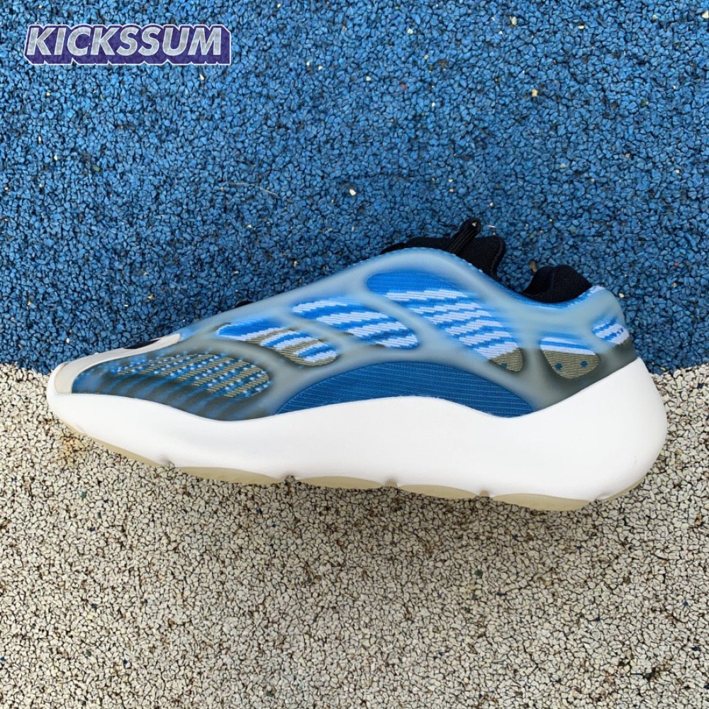The adidas Yeezy 700 V3 "Arzareth" features vibrant blue tones on a breathable knit upper, its side panels overlaid with a semi-translucent RPU cage for added structure and durability. Contrasting black is applied to the sneaker"s bootie-style collar, good for a snug fit around the ankle. The sneaker rides on a PU encapsulated EVA midsole, reinforced underfoot by a herringbone rubber outsole for grippy traction.