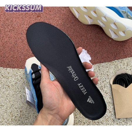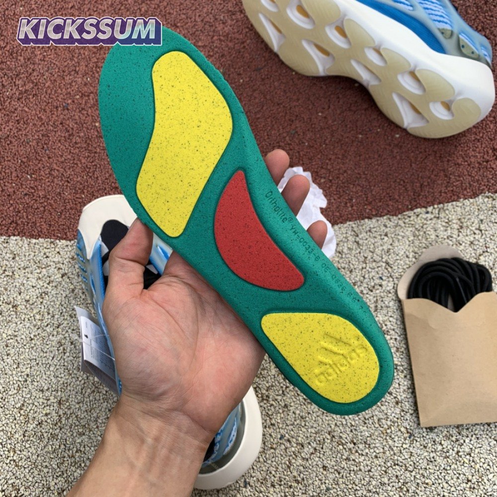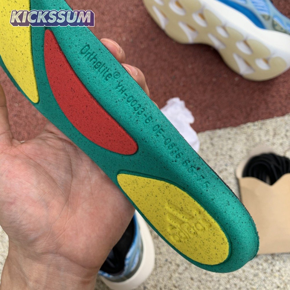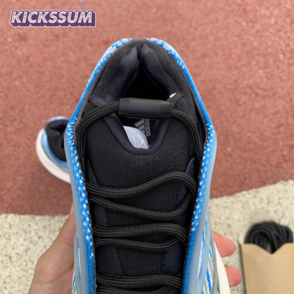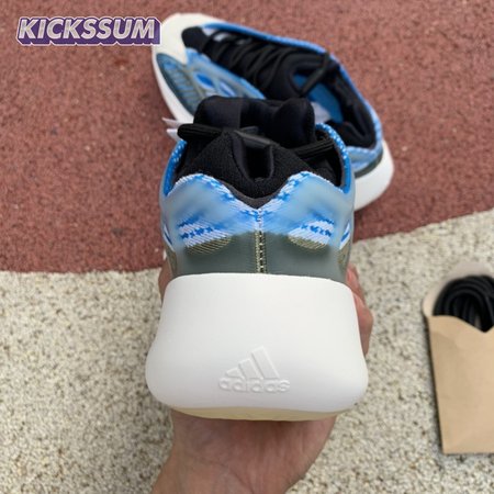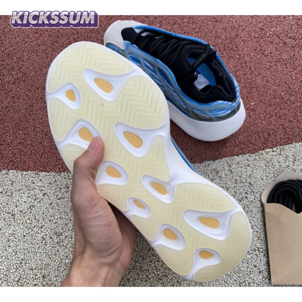 The adidas Yeezy 700 V3 "Arzareth" features vibrant blue tones on a breathable knit upper, its side panels overlaid with a semi-translucent RPU cage for added structure and durability. Contrasting black is applied to the sneaker"s bootie-style collar, good for a snug fit around the ankle. The sneaker rides on a PU encapsulated EVA midsole, reinforced underfoot by a herringbone rubber outsole for grippy traction.