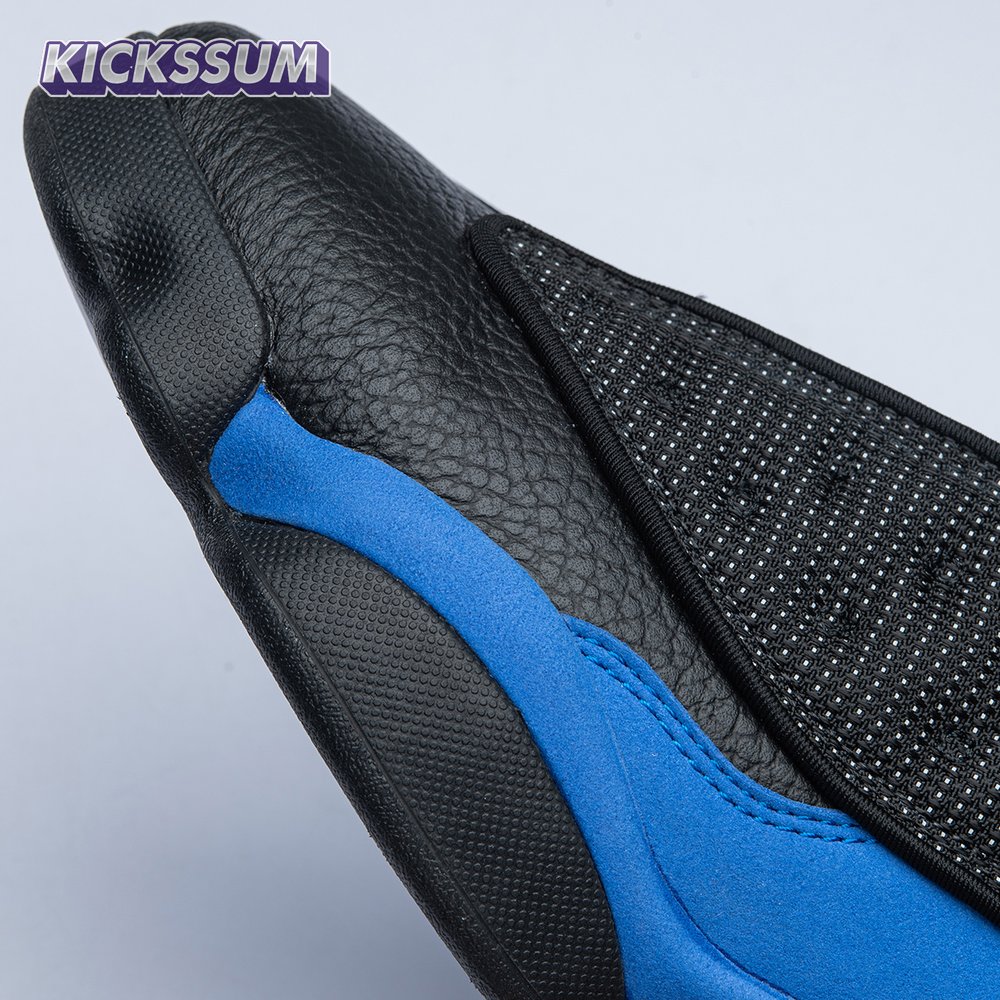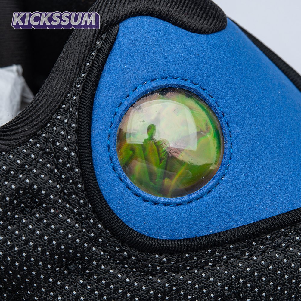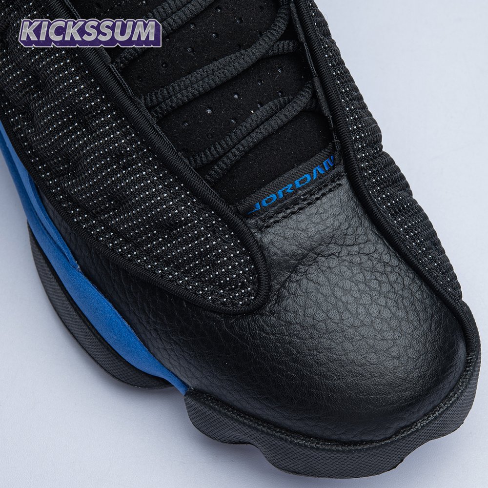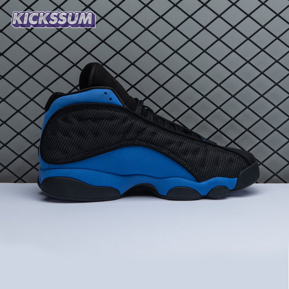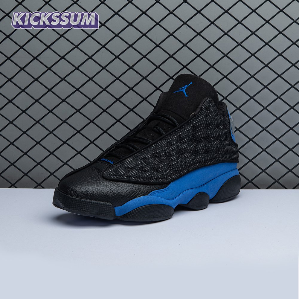 The Air Jordan 13 Retro "Black Royal" features a two-tone design reminiscent of Quentin Richardson"s Orlando Magic PE from 2012. The upper combines black tumbled leather, royal blue suede and reflective mesh overlays. Branding elements include the signature holographic eye and a blue Jumpman logo embroidered atop the tongue. The distinctive cat"s paw outsole is equipped with herringbone rubber for grippy traction underfoot.