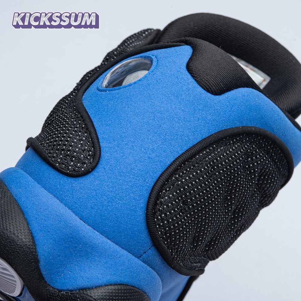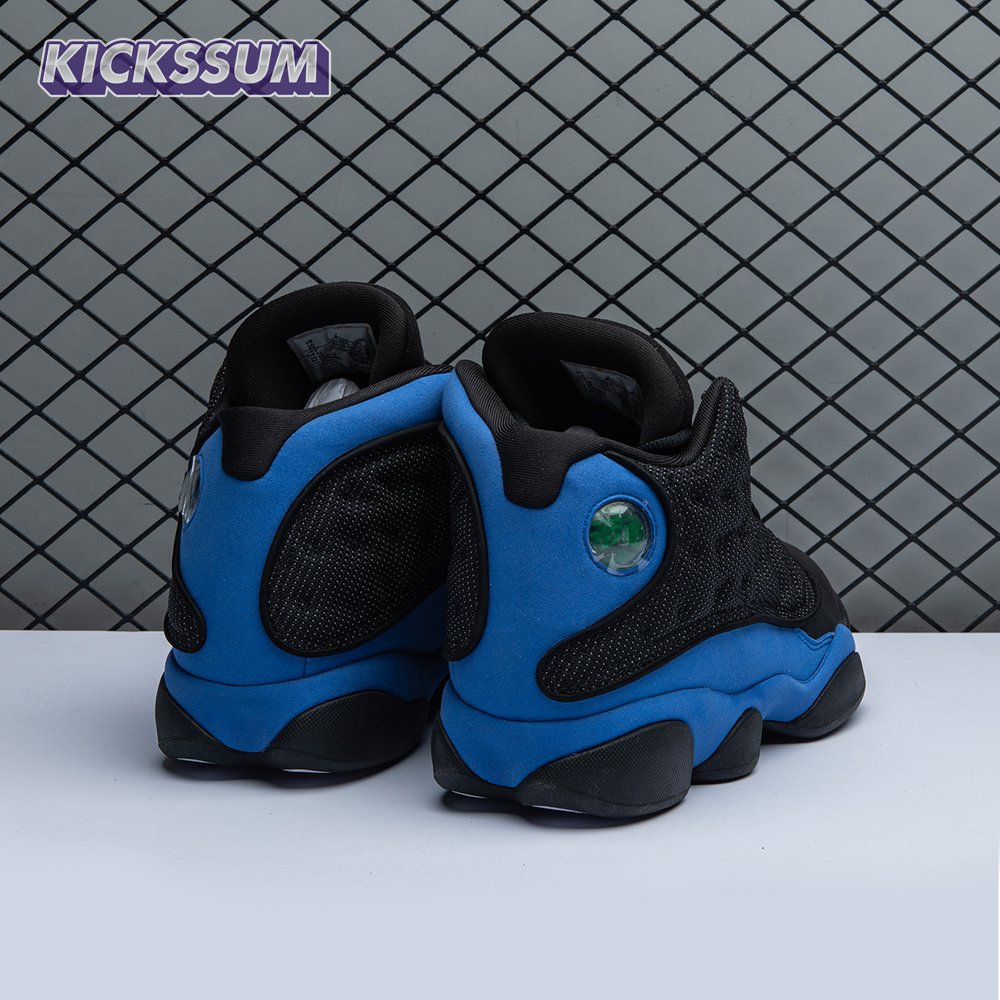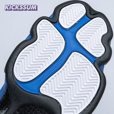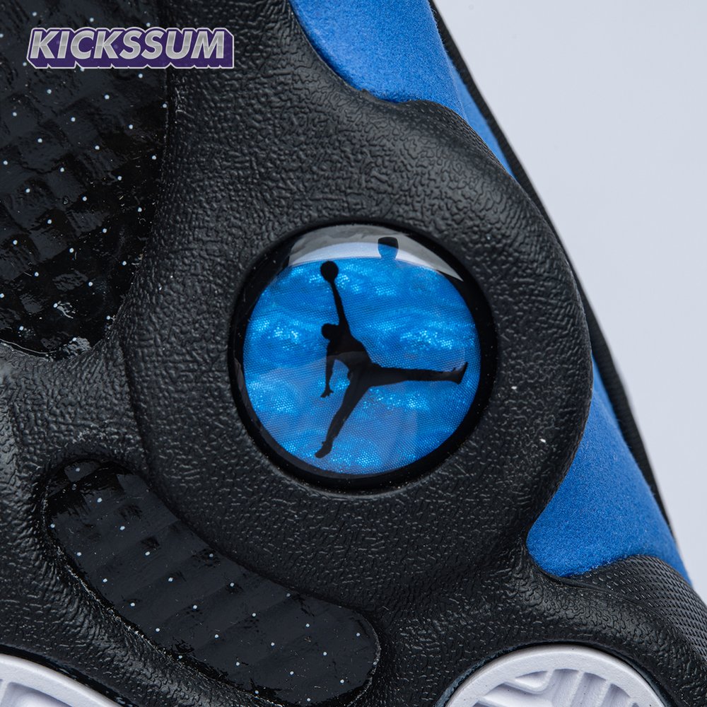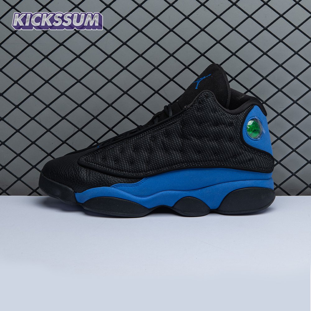 The Air Jordan 13 Retro "Black Royal" features a two-tone design reminiscent of Quentin Richardson"s Orlando Magic PE from 2012. The upper combines black tumbled leather, royal blue suede and reflective mesh overlays. Branding elements include the signature holographic eye and a blue Jumpman logo embroidered atop the tongue. The distinctive cat"s paw outsole is equipped with herringbone rubber for grippy traction underfoot.