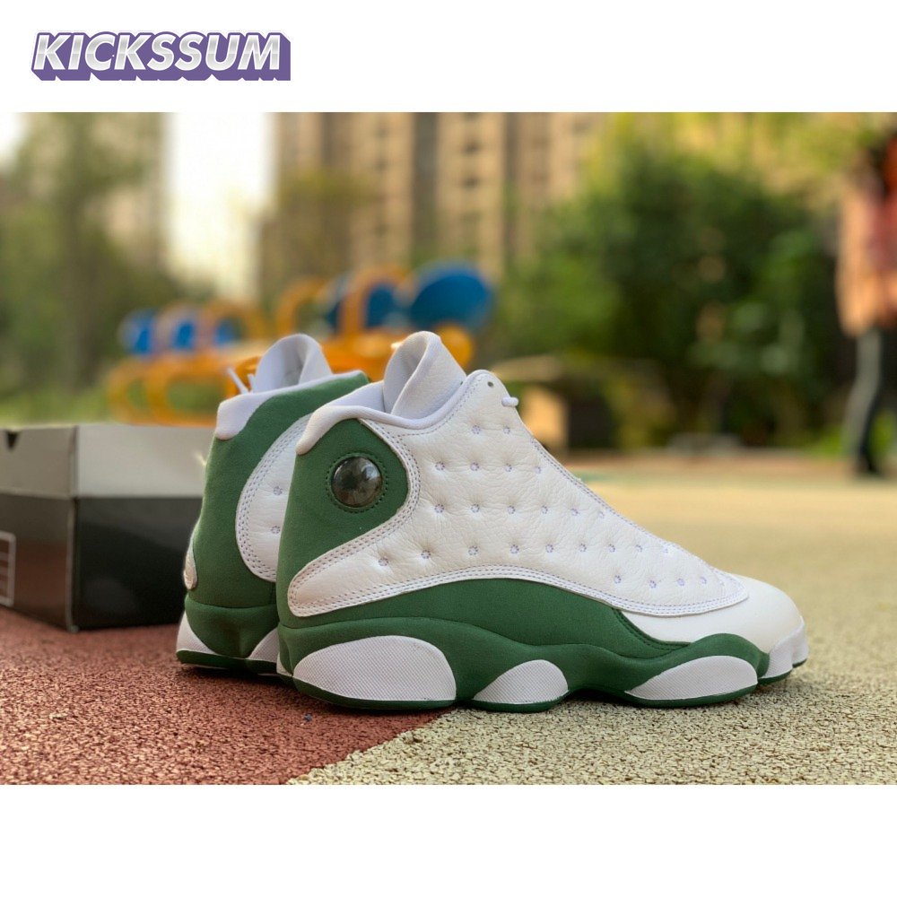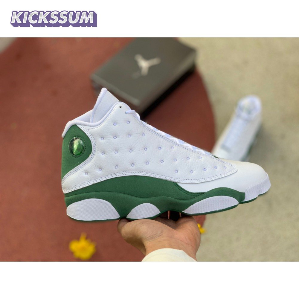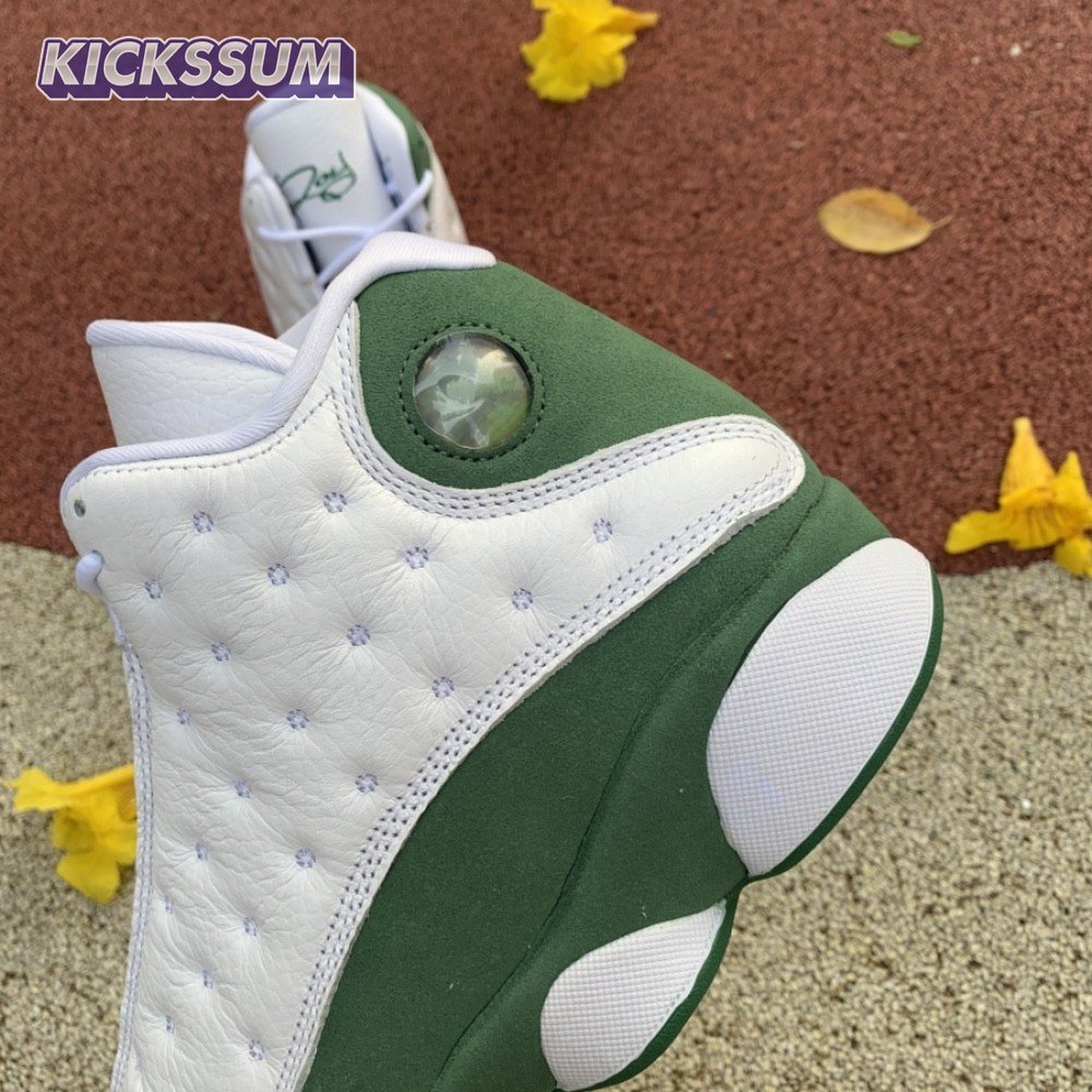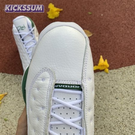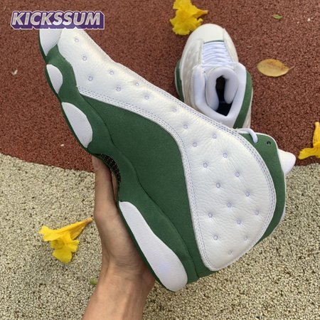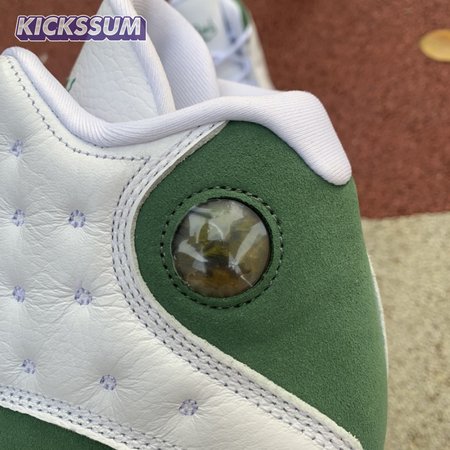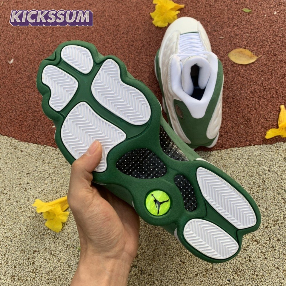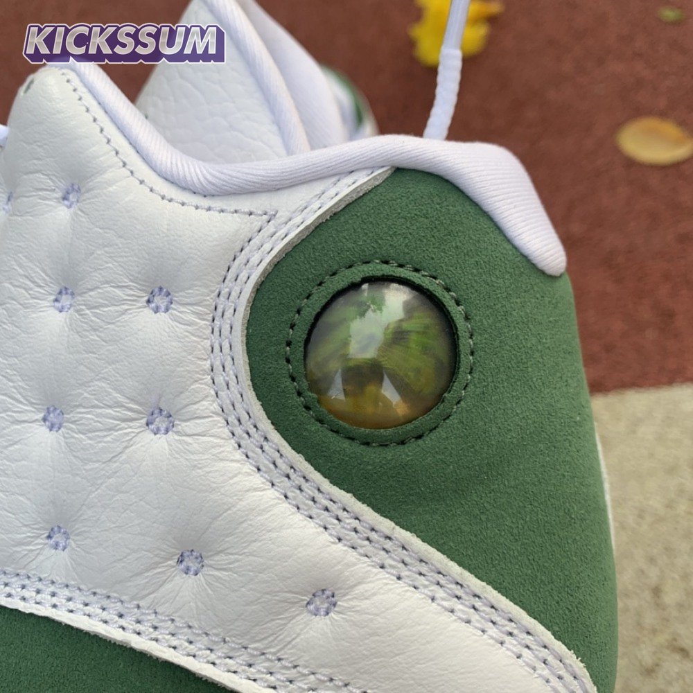 The Air Jordan 13 Retro "Lucky Green" makes use of a familiar design that calls to mind Ray Allen"s coveted Air "Three-Point Record" PE from 2011. The upper combines white tumbled leather with green synthetic suede, supported underfoot by the silhouette"s signature panther paw outsole in black rubber. Branding hits include a green embroidered Jumpman atop the tongue, matching the circular hologram on the lateral ankle.