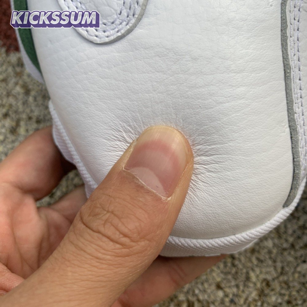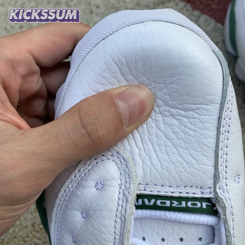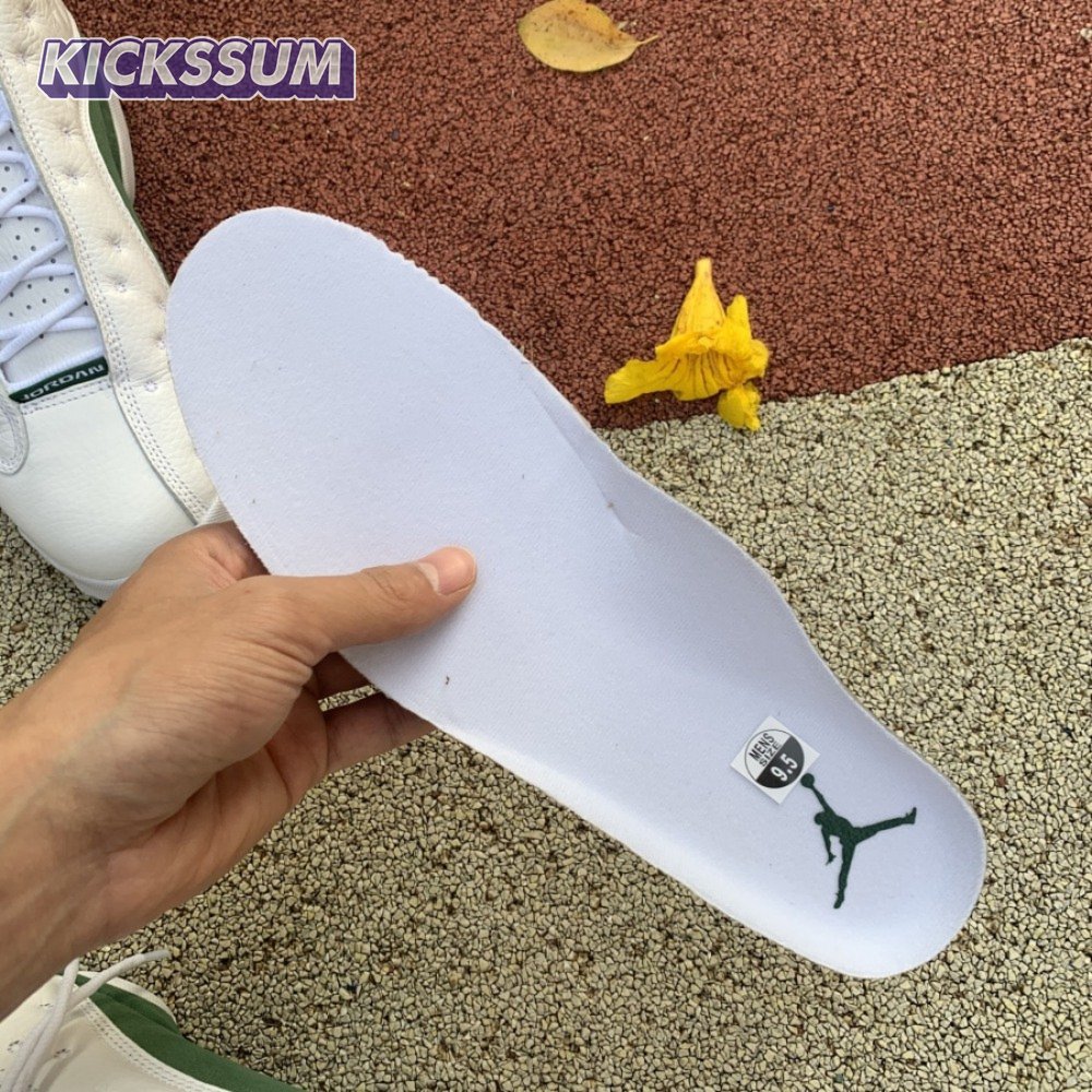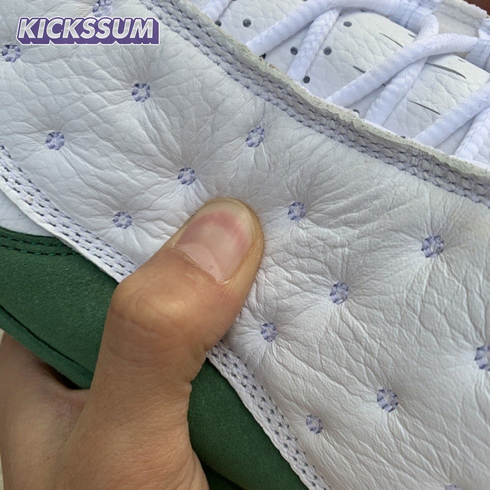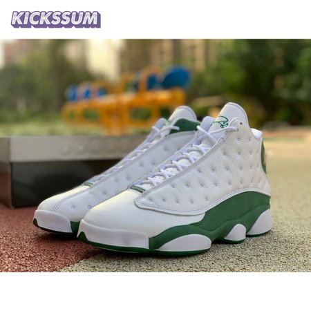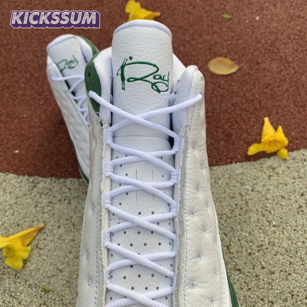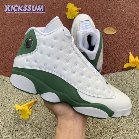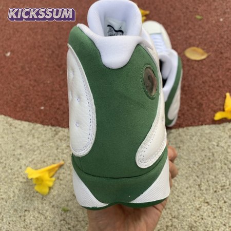 The Air Jordan 13 Retro "Lucky Green" makes use of a familiar design that calls to mind Ray Allen"s coveted Air "Three-Point Record" PE from 2011. The upper combines white tumbled leather with green synthetic suede, supported underfoot by the silhouette"s signature panther paw outsole in black rubber. Branding hits include a green embroidered Jumpman atop the tongue, matching the circular hologram on the lateral ankle.