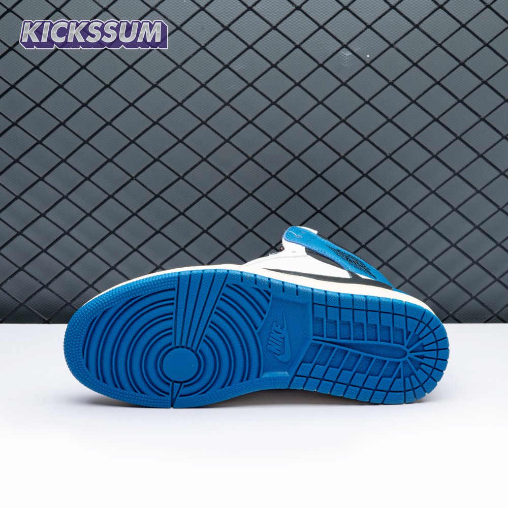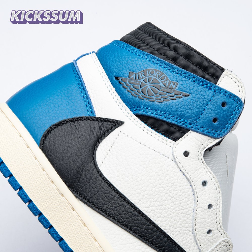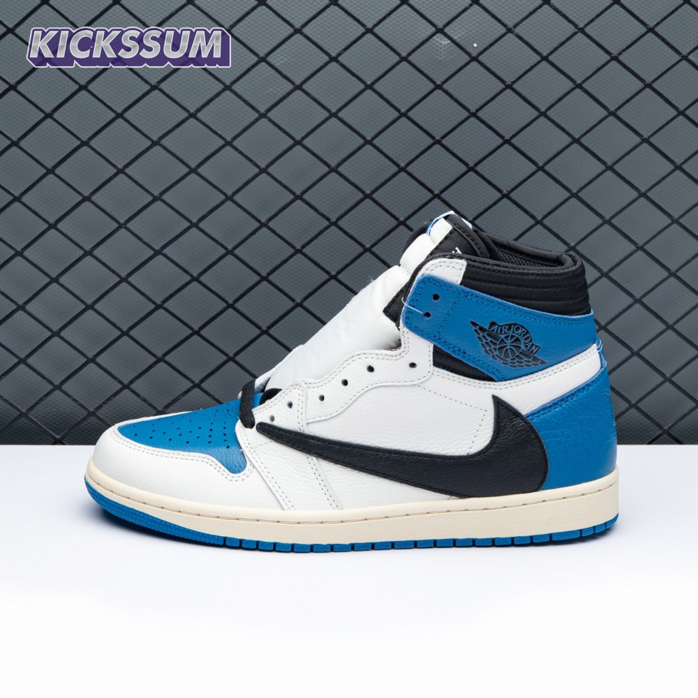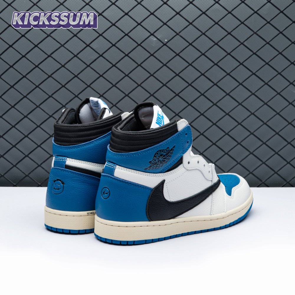 The Fragment Design x Travis Scott x Air Jordan 1 Retro Low delivers a collaboration that blends signature details associated with both La Flame and Hiroshi Fujiwara"s influential imprint. The color palette is reminiscent of past Fragment joint ventures, highlighted by a white leather upper with contrasting overlays in black and royal blue. Scott"s inverted and oversized Swoosh decorates the lateral side panel in an off-white finish, while a standard black Swoosh is stitched onto the opposite side. Cactus Jack branding adorns the heel tab of the left shoe, along with the rapper"s smiley face logo stamped directly underneath. On the heel of the right shoe, a classic Jordan Wings logo is joined by Fragment"s lightning bolt trademark.