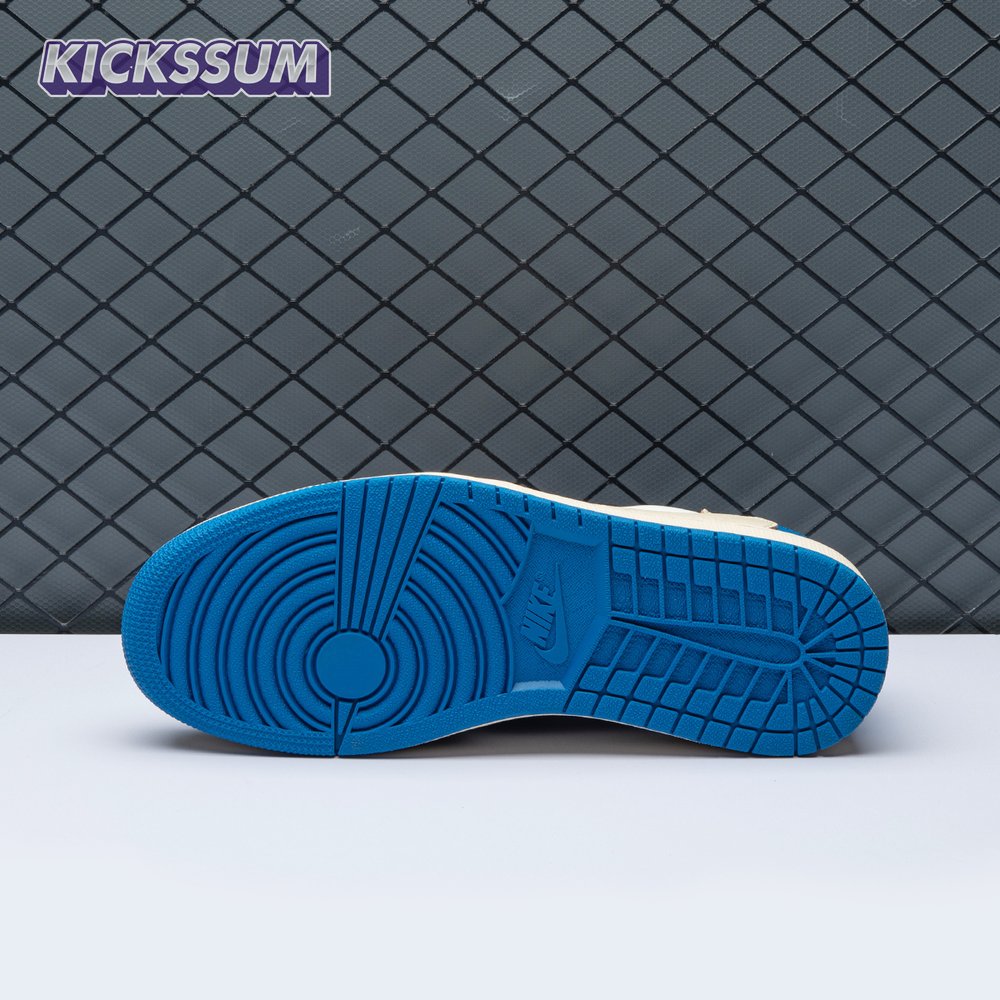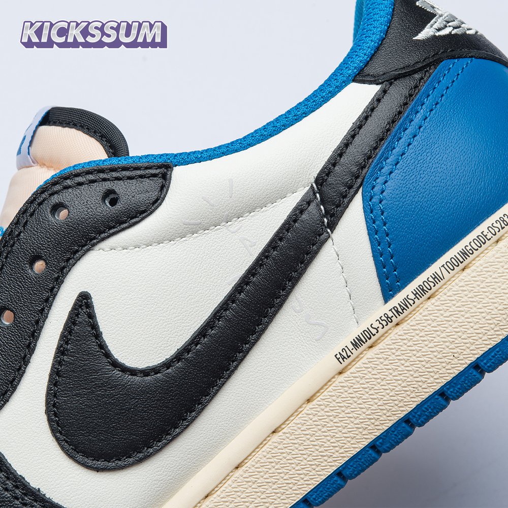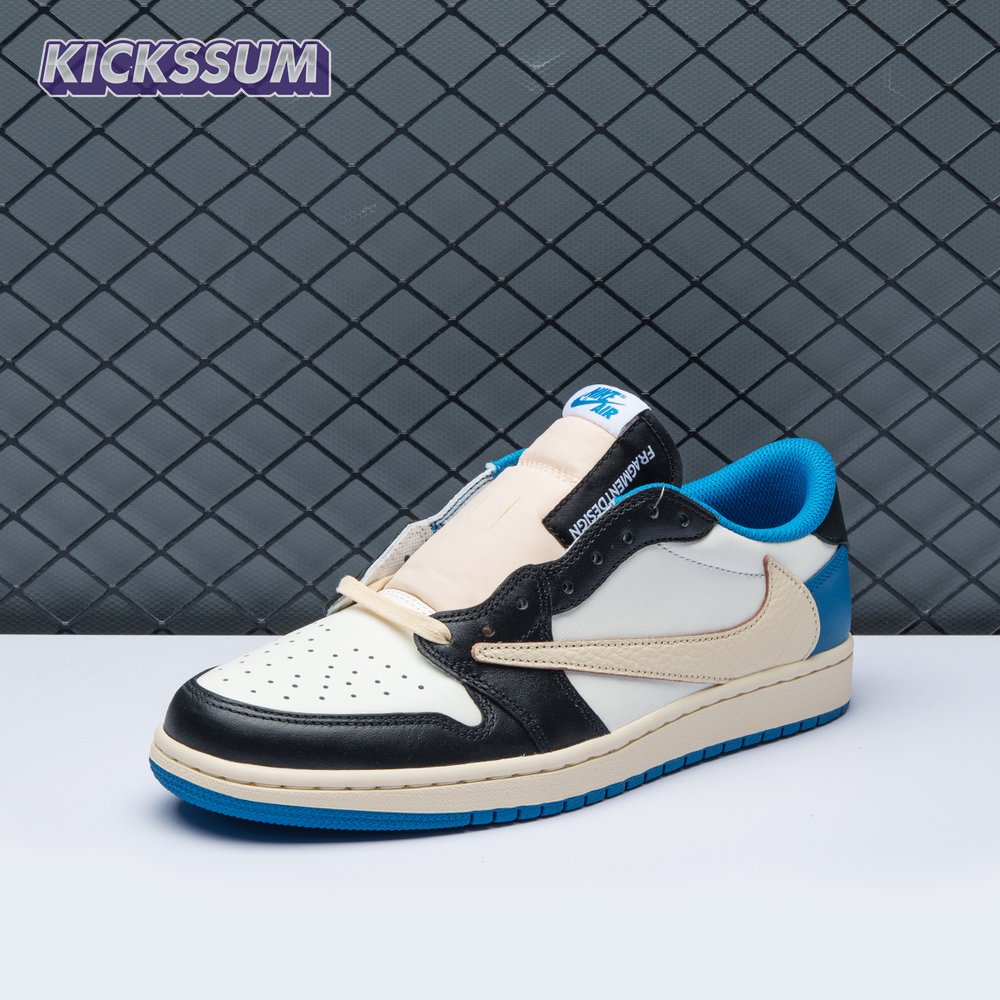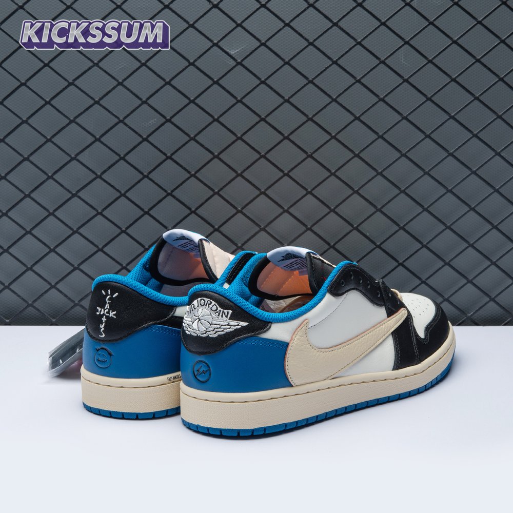 The Fragment Design x Travis Scott x Air Jordan 1 Retro Low delivers a collaboration that blends signature details associated with both La Flame and Hiroshi Fujiwara"s influential imprint. The color palette is reminiscent of past Fragment joint ventures, highlighted by a white leather upper with contrasting overlays in black and royal blue. Scott"s inverted and oversized Swoosh decorates the lateral side panel in an off-white finish, while a standard black Swoosh is stitched onto the opposite side. Cactus Jack branding adorns the heel tab of the left shoe, along with the rapper"s smiley face logo stamped directly underneath. On the heel of the right shoe, a classic Jordan Wings logo is joined by Fragment"s lightning bolt trademark.
