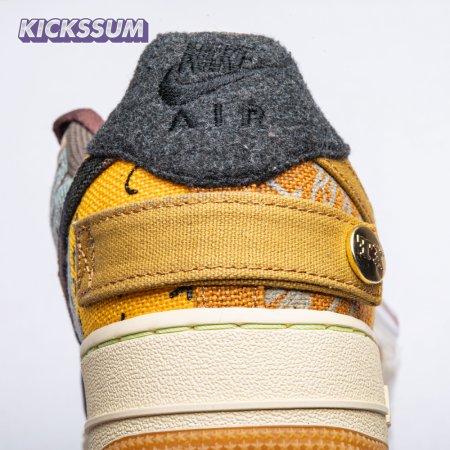 The Travis Scott x Air Force 1 Low 'Cactus Jack' is a unique creation featuring the rapper's trademark utilitarian cues. Released in November 2019, this edition has printed canvas, leather and suede uppers with zipped corduroy lace shrouds and different colored Swooshes on the sides. The sneaker rests atop a classic AF1 midsole and gum rubber outsole.