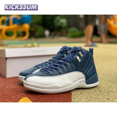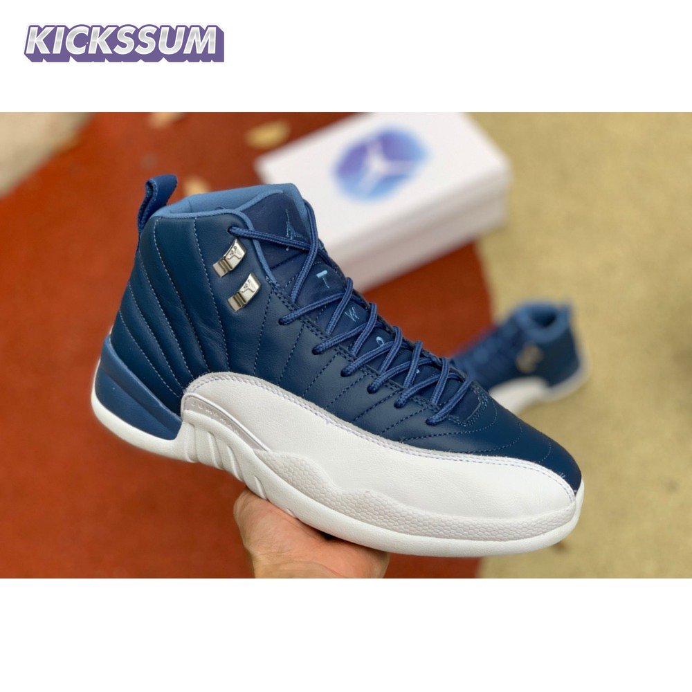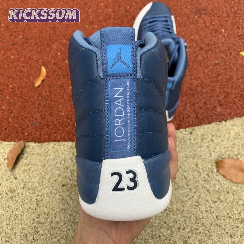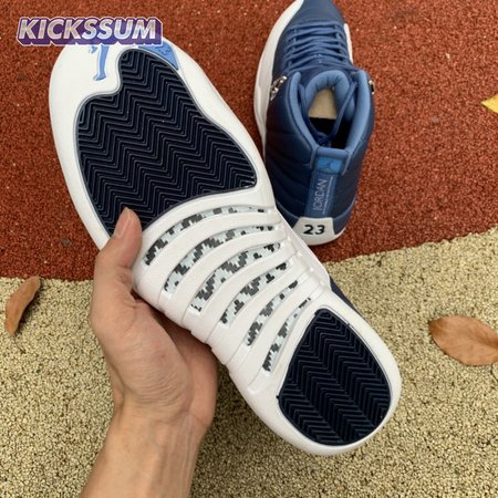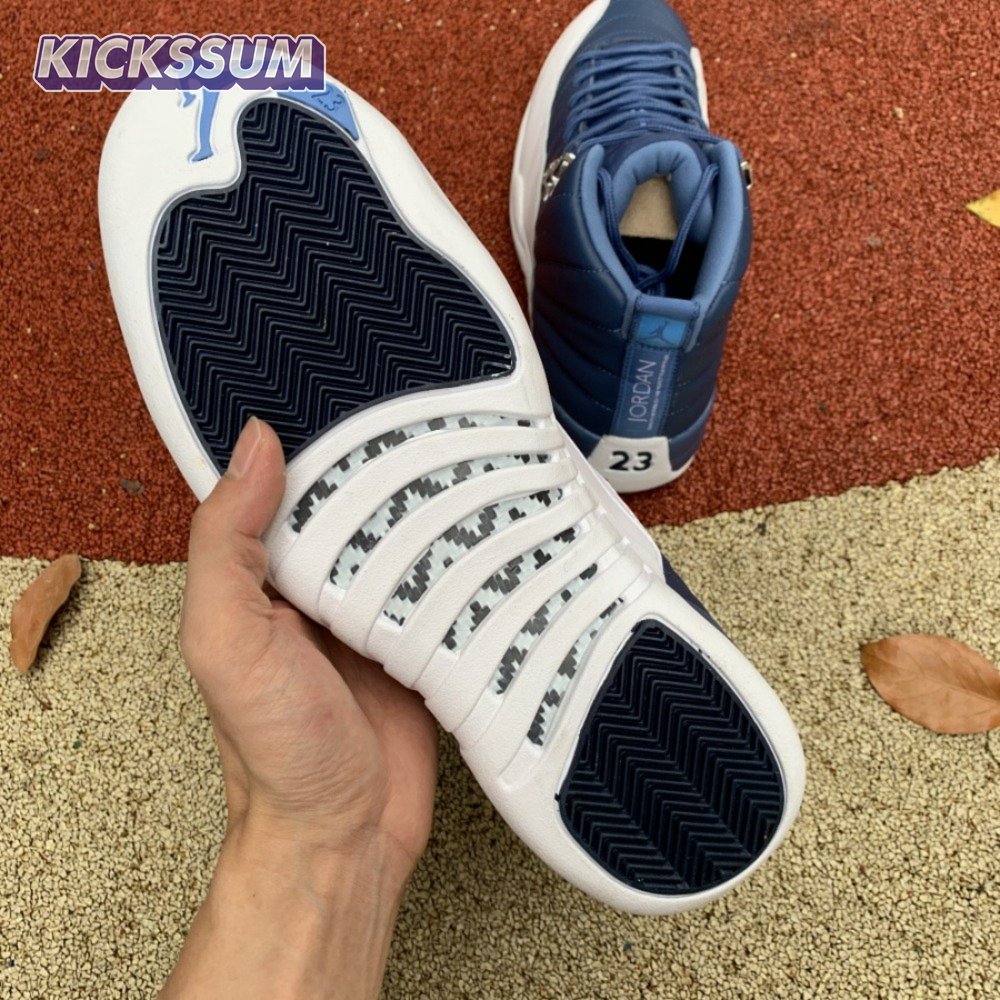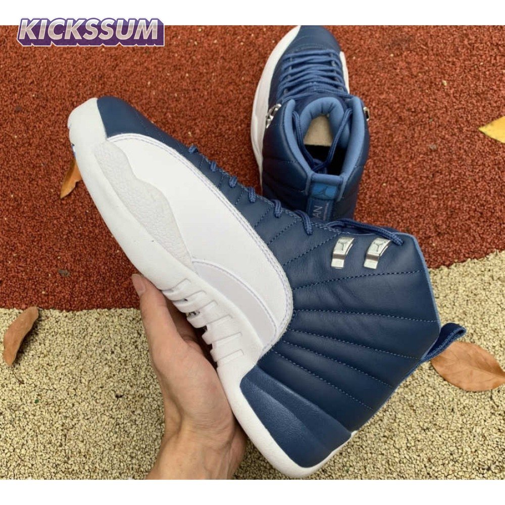 The Air Jordan 12 Retro "Indigo" delivers a simple two-tone colorway of the classic silhouette. The upper makes use of stitched leather in a straightforward indigo hue, accented with a smooth leather mudguard in white. A lighter shade of Legend Blue appears on the heel tab and embroidered Jumpman atop the tongue. The silhouette"s subtle lizard texture is limited to the midsole, reinforced by a herringbone rubber outsole and a carbon fiber shank.