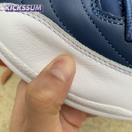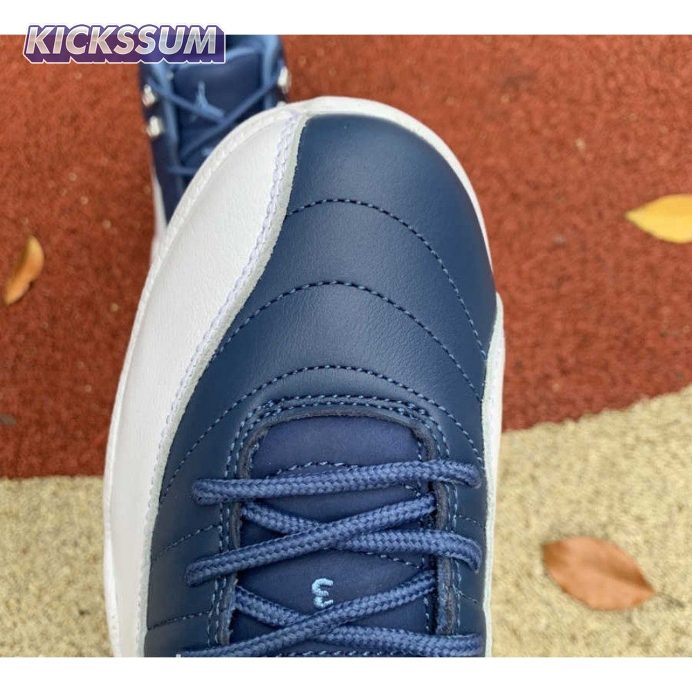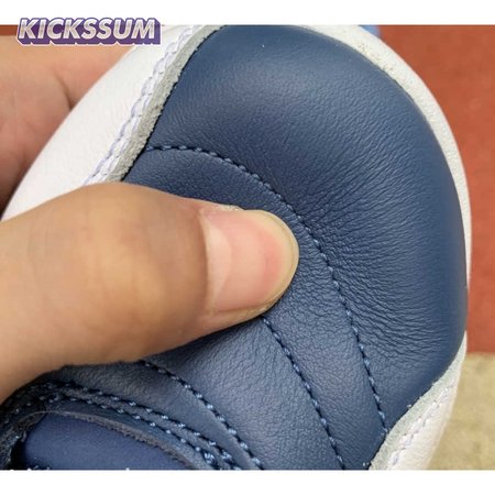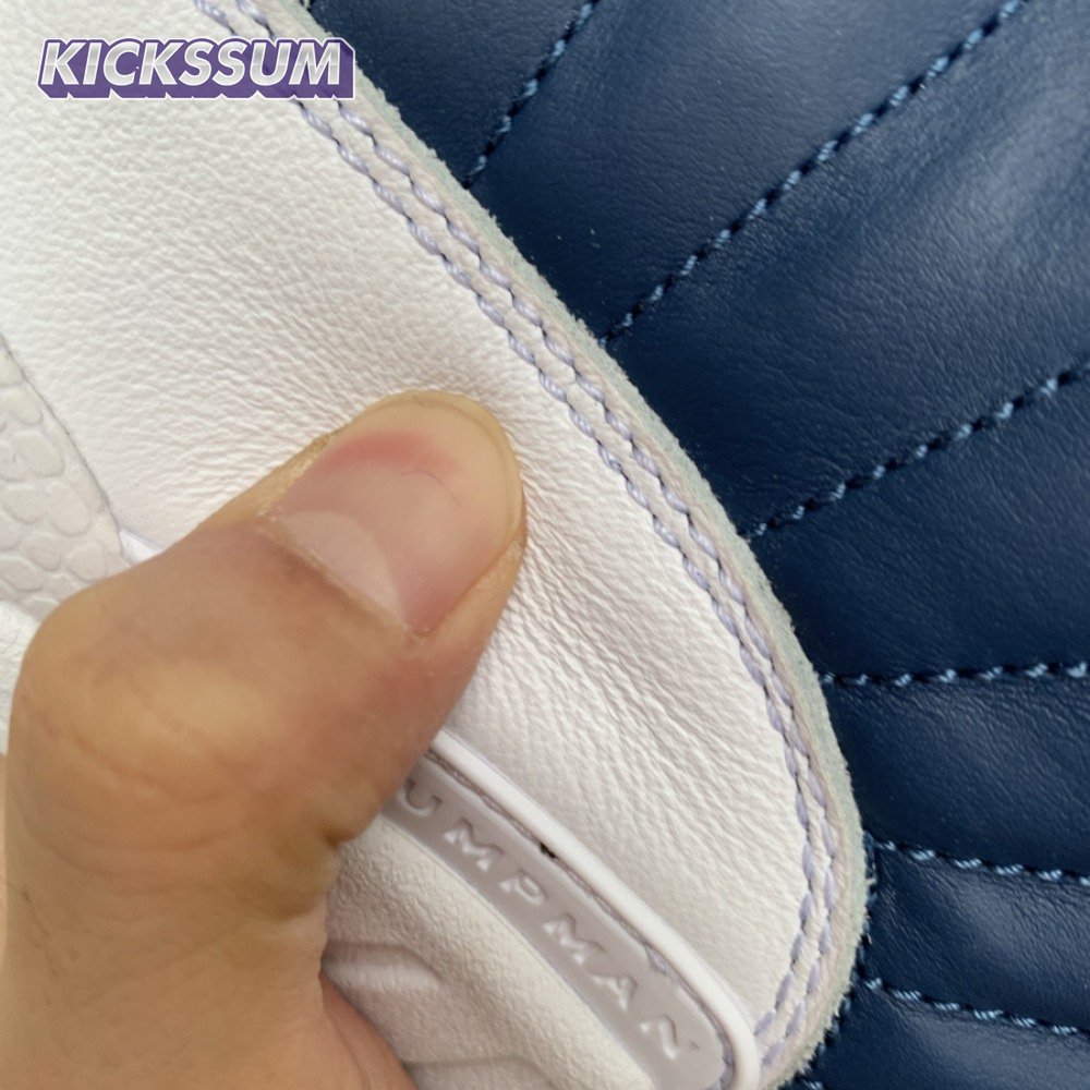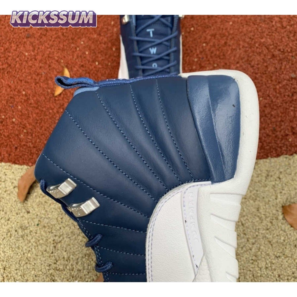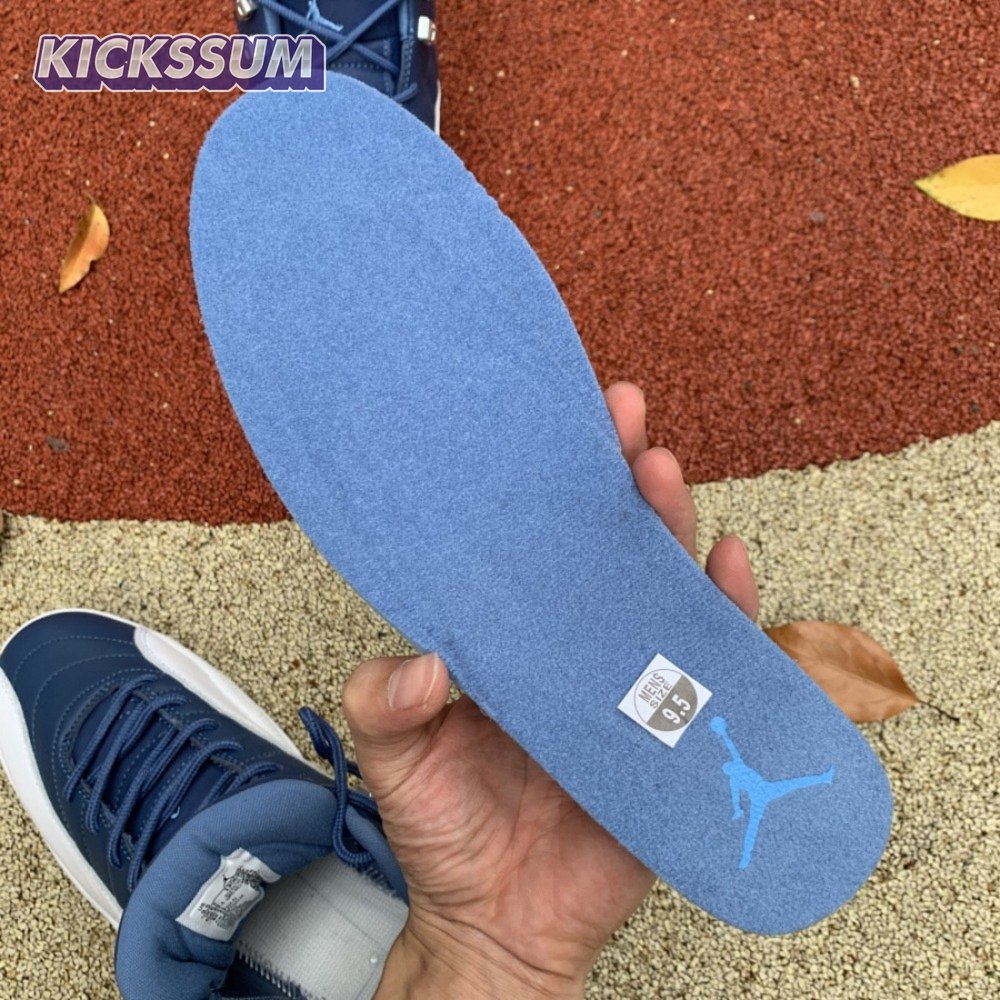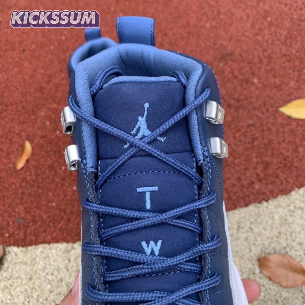 The Air Jordan 12 Retro "Indigo" delivers a simple two-tone colorway of the classic silhouette. The upper makes use of stitched leather in a straightforward indigo hue, accented with a smooth leather mudguard in white. A lighter shade of Legend Blue appears on the heel tab and embroidered Jumpman atop the tongue. The silhouette"s subtle lizard texture is limited to the midsole, reinforced by a herringbone rubber outsole and a carbon fiber shank.