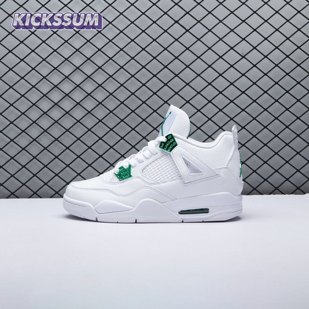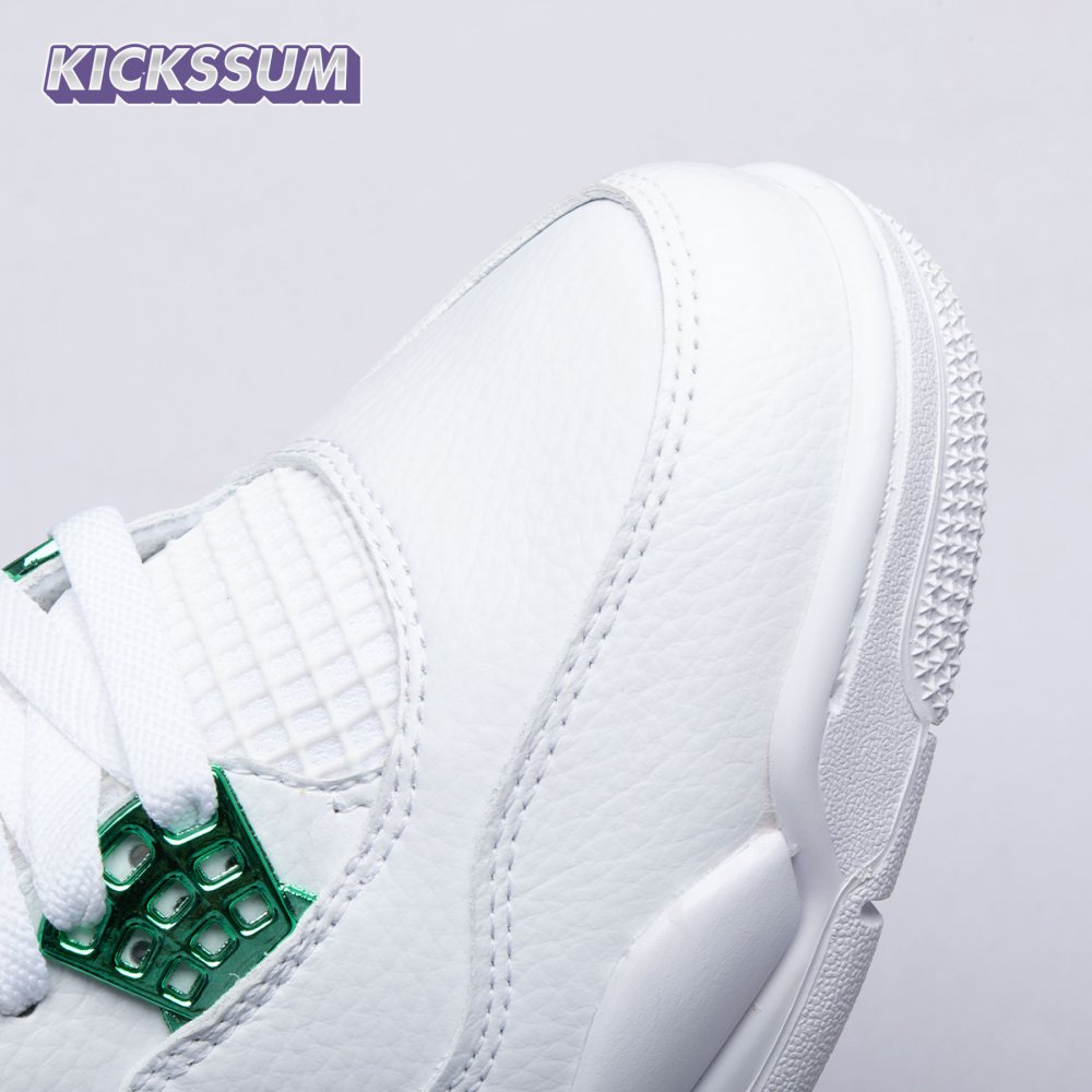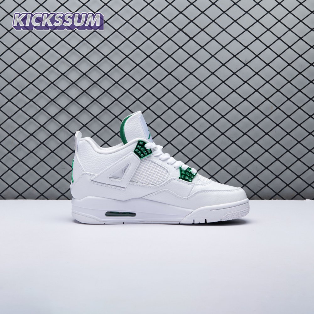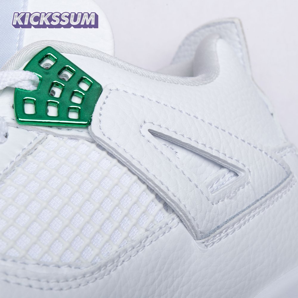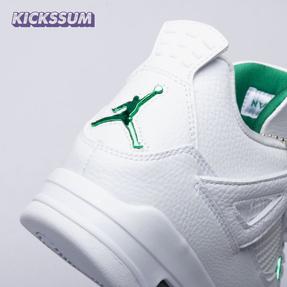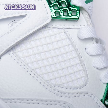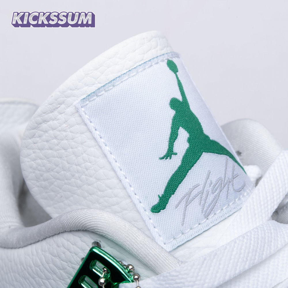 The Air Jordan 4 Retro "Green Metallic" is drawn from a four-piece Metallic Pack that features a single accent color. Here, the metallic green hue is limited to the sneaker"s molded eyelets, interior tongue, and the Jumpman logos that adorn the heel and woven tongue tag. Those elements stand out against a pristine all-white leather build, appointed with standard Air Jordan 4 details that include quarter-panel netting, a visible Air sole unit and an extended pull tab at the heel.