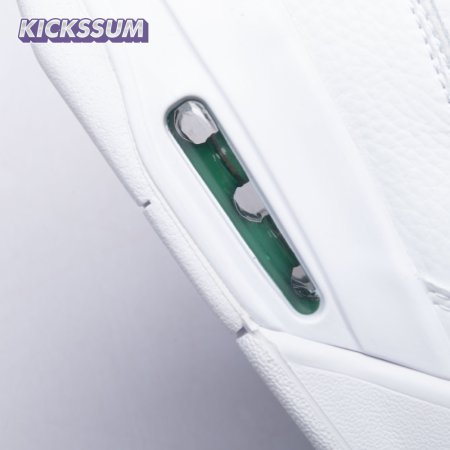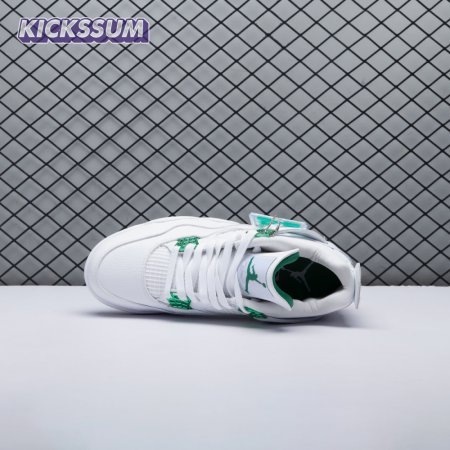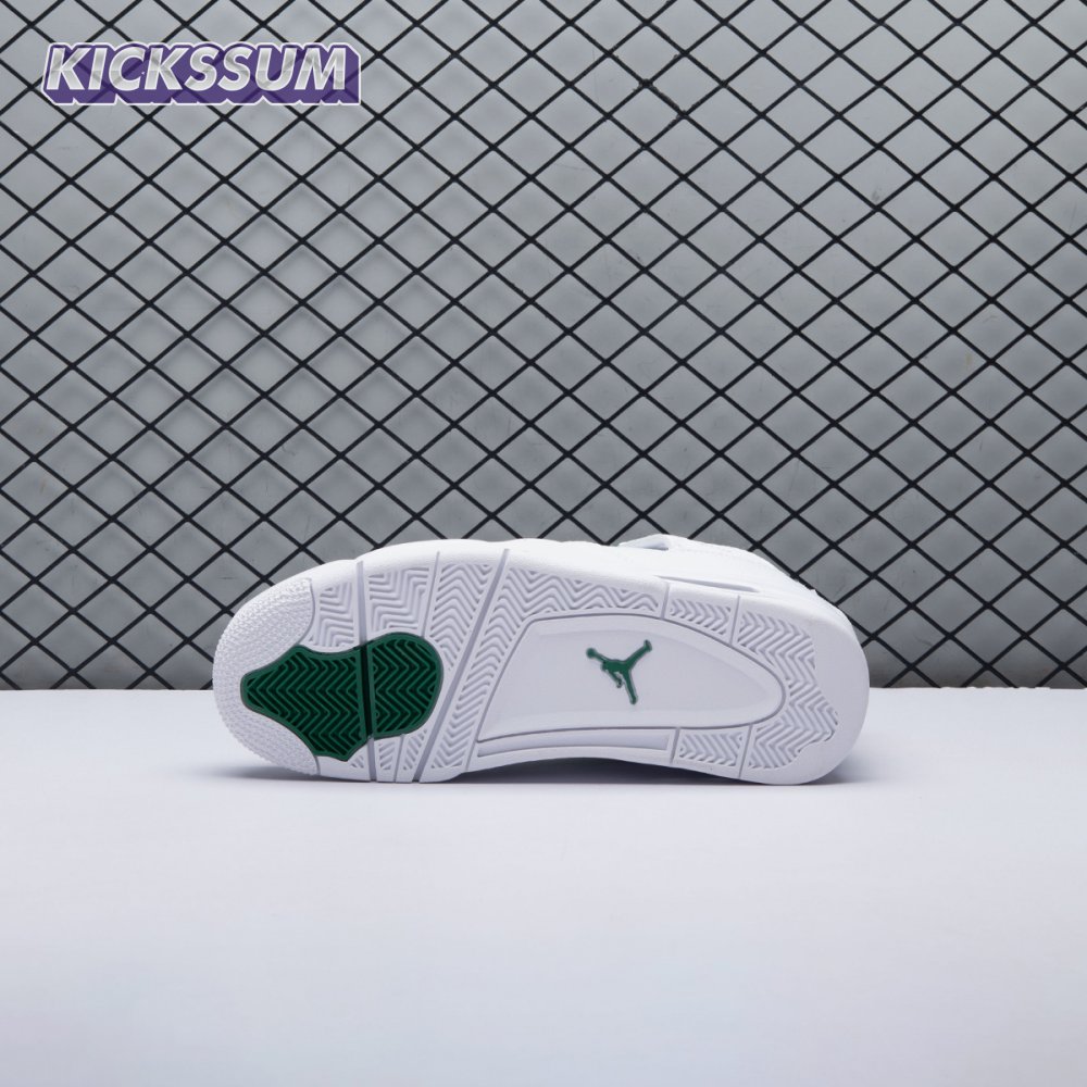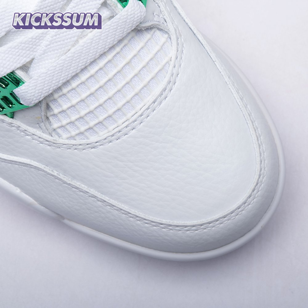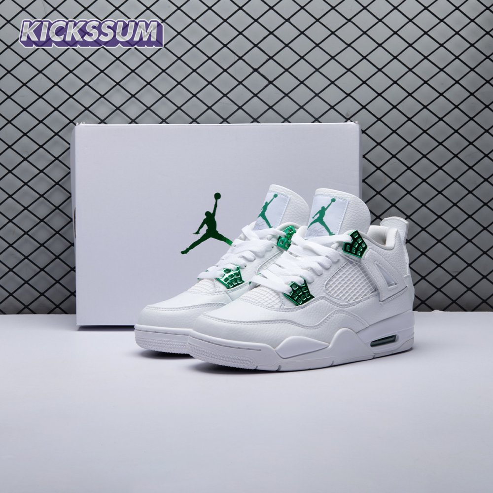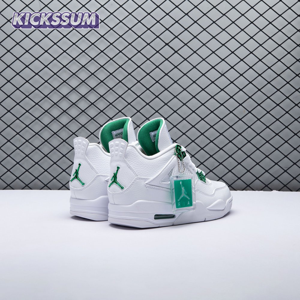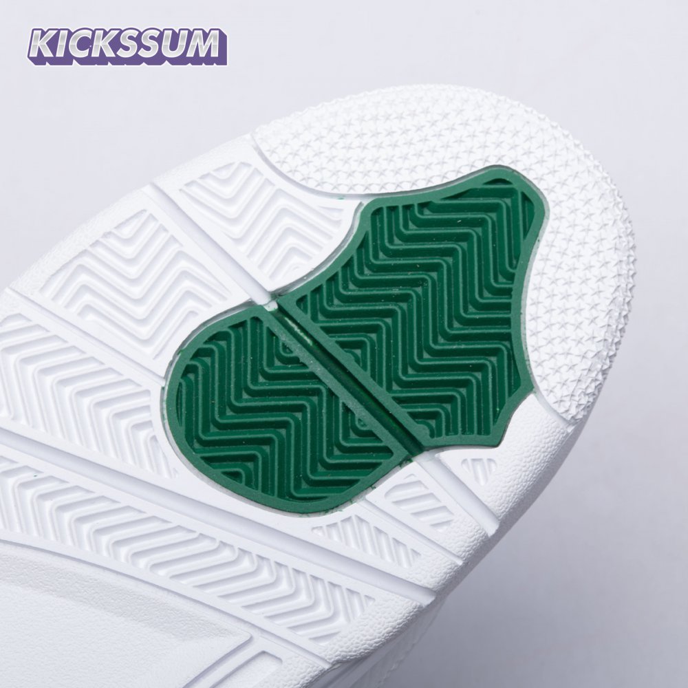 The Air Jordan 4 Retro "Green Metallic" is drawn from a four-piece Metallic Pack that features a single accent color. Here, the metallic green hue is limited to the sneaker"s molded eyelets, interior tongue, and the Jumpman logos that adorn the heel and woven tongue tag. Those elements stand out against a pristine all-white leather build, appointed with standard Air Jordan 4 details that include quarter-panel netting, a visible Air sole unit and an extended pull tab at the heel.